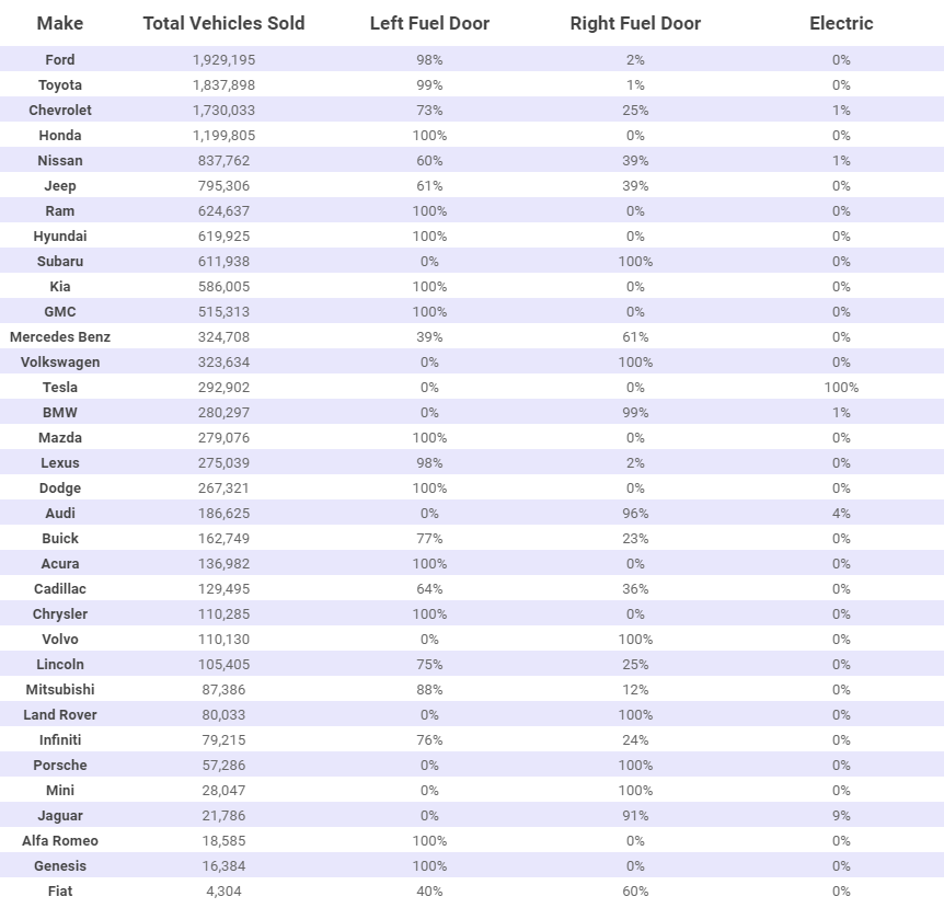 From a brand perspective, it was interesting to see how some brands like BMW, Honda, and Audi built all their vehicle with fuel door on a single side, while others such as Mercedes, Chevy, and Jeep really mix it up. Toyota typically places the gas cap on the left side but uses the right side for some of their rarer models such as the Supra, Land Cruiser, and 86. And then some cars don’t have a gas door at all, such as the Audi eTron, BMW i3, and the Jaguar i-Pace. Here are the findings sorted by makes with the most vehicles sold: