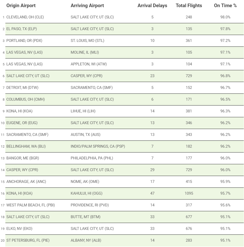 The two factors that stand out are the top performing routes are arriving into “good weather” airports like SLC or OGG, or they are arriving into regional airports with significantly less traffic than the majors like EWR, LAX, ATL etc.